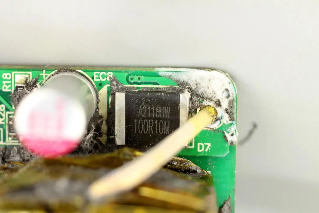 充電器內(nèi)部PCBA模塊采用黃銅散熱片包裹,PCB正面打膠,背面有導(dǎo)熱墊,將熱量傳導(dǎo)至散熱片散發(fā),滿足長(zhǎng)時(shí)間大功率輸出設(shè)計(jì)。初級(jí)濾波電容來(lái)自黃寶石,次級(jí)固態(tài)濾波電容來(lái)自柏瑞凱,整機(jī)用料均為知名品牌。